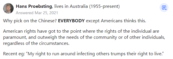 为什么要挑中国人出来说事?除了美国人,所有人都这么想。美式人权已经到了个人权利至上的地步,无论在何种情况下,个人权利都超过了社区或其他个人的需要。举个最近的例子:“我四处活动感染他人的权利高于他们活着的权利。”