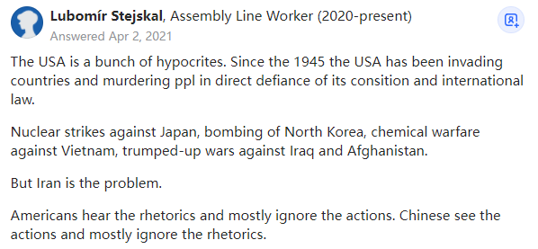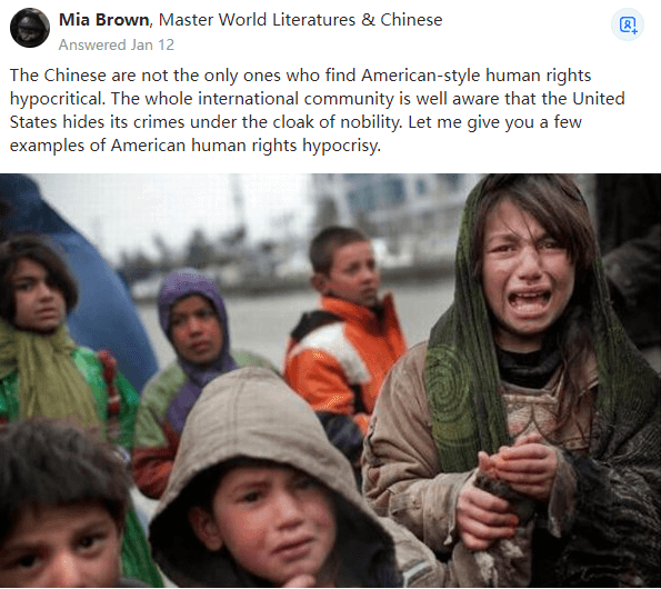 网文来自网友原文翻译投稿,所有言论皆不代表本站立场 | 本文文字/图片来自网络,侵删 | 点击页眉也可刷新 | 本文内容仅供娱乐,不作任何严肃之用途美国人这些年到底在全世界做了些什么?为什么中国人认为美式人权很虚伪?本文译自Quora,原标题:Why do the Chinese think that American-style human rights are hypocritical?