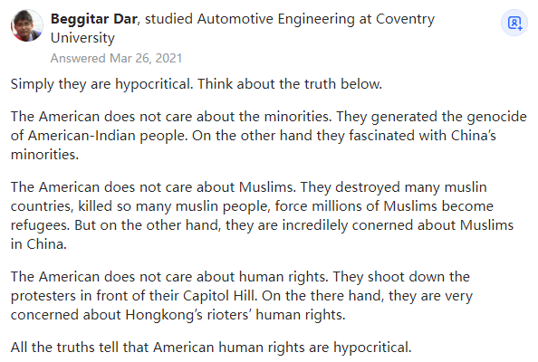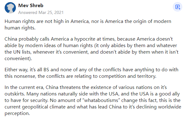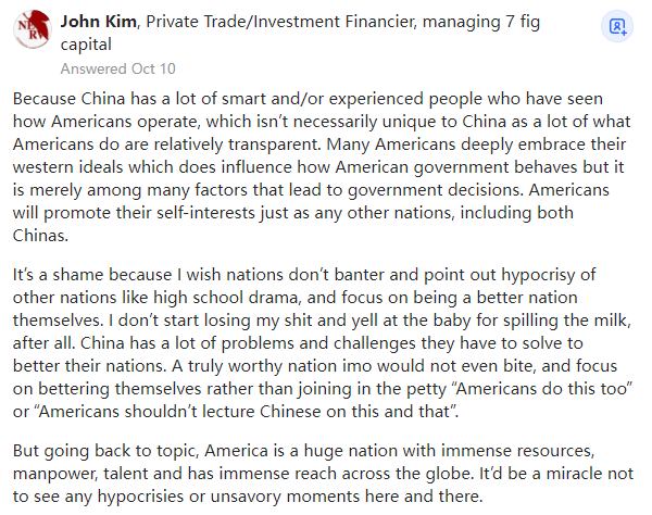 因为中国有很多聪明和/或经验丰富的人,他们了解美国人的运作方式,这(即觉得美式人权虚伪)并不一定是中国独有的,因为美国人做的很多事情都是相对透明的。许多美国人深深信奉他们的西方理念,这确实影响了美国政府的行为,但这只是导致政府决策的众多因素之一。美国人像任何其他国家(包括中国)一样着眼于提升自身的利益。这是一种耻辱,因为我希望各国不要像高中戏剧(high school drama)那样戏谑和指出其他国家的虚伪,而是专注于使自己成为一个更好的国家。为了成为一个更好的国家,中国有很多问题和挑战需要解决。在我看来,一个真正有价值的国家甚至不会盯着别人,在“美国人也这样做”或“美国人不应该在这个和那个上教训中国人”上小题大做,而是专注于改善自己。但回到话题上来,美国是一个拥有巨大的资源、人力和人才的大国,它在全球拥有巨大影响,这样一个国家要在所有地方都看不到任何虚伪或令人不快的行为将是一个奇迹。美国的人权水平并不高,美国也不是现代人权理念的起源地。中国有时可能会称美国为伪君子,因为美国不遵守现代人权理念(它只在方便的时候遵守这些理念和联合国列出的任何内容,在不方便的时候不遵守它们)。不管怎样,这都是胡说八道,任何冲突都与这种胡说八道无关,而都与竞争和领土有关。在当今时代,中国威|胁着周边各国的生存,许多国家自然而然地站在了美国一边,因为美国是安全方面的好盟友。无论什么样的“比烂主义”(Whataboutism)都无法改变这一事实,这是当前的地缘政治气候,也是导致中国全球美誉度下降的原因。译注:比烂主义(Whataboutism),指的是苏联在冷战时期对西方世界使用的一种政治宣传技巧,每当有人批评苏联,就会获得形如“那(西方世界的某某事件)呢?”(What about…?)的回应。这种技巧是“你也一样”(诉诸伪善)这种逻辑谬误的应用,试图通过指出对手言行不一之处削弱其可信度,而不直接反驳其论点。1933年,鲁迅在《外国也有》一文中提到:“凡中国所有的,外国也都有。外国人说中国多臭虫,但西洋也有臭虫。”他借此批判当时的中国人,在面对批评时会声称其他国家也有相同的错误,来掩饰自己的过错。