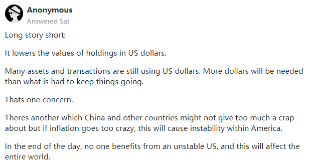 美联储在2009年之后实施了量化宽松政策,并在大流行期间再次实施。由于许多资产和交易仍在使用美元,这将需要更多的美元来维持交易。还有一个问题中国和其他国家可能不会太在意,但如果通货膨胀变得太疯狂,这将导致美国国内的不稳定。归根结底,没有人能从不稳定的美国中获益,这将影响整个世界。用美元结算的国际贸易将减少,因为当美元作为世界储备货币在状态疲软时,各国会回避使用。美国可以通过提高其债券的利率,出售黄金,或发动战争来维持美元作为世界储备货币的地位。