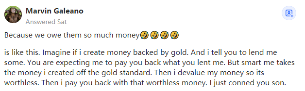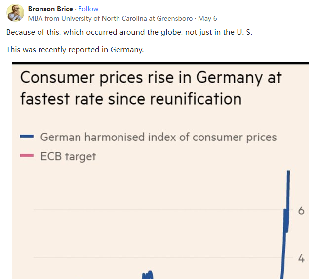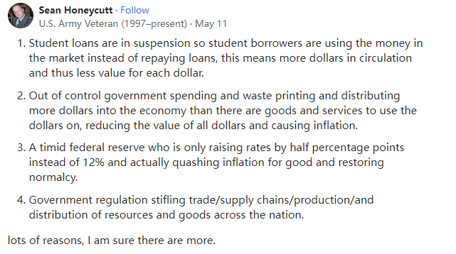 美国已陷入债务陷阱,外国投资者对美债的投资已降至约为零,美联储(Federal reserve)和养老基金目前是美债的主要支持者。看起来美元正在崩溃,通货膨胀正在蔓延,世界正在向东转。我目前的看法是,如果美元失去储备货币地位,美国经济将陷入恶性通胀,全世界将调整对美国的依赖。是这样的。想象一下,如果我创造了以黄金为后盾的货币,我让你借给我一些钱,你指望我还你借给我的钱,但聪明的我早就把我在金本位制下创造的钱拿走了,然后我把我的钱贬值,这样它就一文不值了,然后我再用那些不值钱的钱来还给你。我只是在欺骗你,宝贝。Veteran of Software industry. Anglo / Canadian. MBA. I Speak 3 foreign languages软件行业资深人士,盎格鲁/加拿大人,工商管理硕士,我会说三种外语因为中国拥有数万亿美元的外汇储备,通货膨胀将使这万亿美元贬值,而中国则亏大了。Lives in The United States of America因为刺激支票(stimulus checks,即发钱)、冻结租金、提高失业救济、购买力平价贷款、接近零的借款成本(非常低的利率)、美联储通过购买美国国债和抵押贷款支持证券并扩大其资产负债表向市场注入现金——宽松的货币和财政政策都是由疫情驱动的。此外,乌克兰/俄罗斯冲突/中国对大流行的封锁都会影响石油/谷物/矿物/制成品的供应,以及由于当前较高的天然气和石油价格,欧洲和英国的通货膨胀加剧,所有这些都是影响美国经济的因素。Studied Engineering & Sociology有很多原因,但通货膨胀的唯一原因是可用资金超过了可用于购买的物品。几十年来美国的利率一直很低,这使得消费者和企业能够通过借贷凭空创造大量资金。当一个人可以借一百万美元买房时,这将在全国范围内为经济注入大量的资金。随后,新型冠状病毒出现了,劳动力和供应突然发生短缺而且工资飙升,这就产生了大量无处可去的资金盈余。此外,政府花钱让人们呆在家里并在封锁后继续刺激经济。当时,石油产量的下降导致了石油短缺,现在又对普京实施了制裁,所有这些都为通货膨胀创造了完美的条件。因此,有两种方法可以解决通货膨胀问题,一是这个国家生产更多的东西供消费者消费,但当失业率处于历史低点时,很难挤出更多的商品生产或增加劳动力的可用性。因此,唯一的其他选择是通过提高利率来减少货币供应量。这将减少支出,使商品和劳动力供应能够再次和市场上的资金相匹配,并有望降低通货膨胀率。但棘手的问题是高能源成本,这是通货膨胀的一大驱动力。如果燃料成本居高不下,而消费者的消费能力下降,那么我们就会出现滞胀,这远比通货膨胀更严重。滞胀几乎肯定会导致经济衰退,虽然最终会降低通货膨胀,但会以牺牲数百万就业机会为代价。因此,这就是美国将在2022年甚至以后面临的现状。MBA from University of North Carolina at Greensboro,Lives in America这是德国44年来的通货膨胀的最高点,具体来说,就是“一年内的变动率”超过了过去44年中任何一年的变动率。在美国平均通货膨胀率下降的40年中的每一年中,你都会预期较低的变动率。事实上,美联储经常未能在2021之前达到其2%的年度通胀目标。在2020年期间,美联储的利率创下了两个历史新低。这次的 40 年的高点是从这些创纪录的低点来衡量的。从游泳池最深处的底部弹跳比从游泳池较浅的底部弹跳的效果更好。事实是!每次衰退之后,在6-12个月内都会出现高于趋势的通货膨胀期。与1980年、1981年、1991年、2001年和2008年一样,在每次衰退之后,通常会在6-12个月内出现一段高于趋势的通货膨胀(主要是作为滞后指标)。由于百年一遇的全球大流行的额外影响,这段正常的后衰退期被夸大了。举个例子,德国和美国的通货膨胀正经历44年和40年来的最高点,这是因为我们刚刚结束了40多年的通货紧缩(或者说通货膨胀的下降),这是在年利率创历史新高之后开始的。如果你注意的话,你会发现这一年的通货膨胀带来的极度不适主要体现在租金、新车和二手车、交通、汽油/石油上,这些方面的涨幅最极端,其中一些细分市场本身已经经历了40%以上的价格上涨。U.S. Army Veteran (1997–present)1.学生贷款暂停,因此学生借款人把钱花在了市场上而不是偿还贷款,这意味着流通中的美元更多,因此每一美元的价值更低。2.政府支出失控,由于印刷了太多废纸以及向经济中分配的美元超过了能够使用美元购买的商品和服务,这降低了所有美元的价值并导致了通货膨胀。3.一个胆小的美联储,只将利率提高了半个百分点而不是 12%(这实际上将永远抑制通货膨胀并使经济恢复正常)。4.政府监管扼杀了全国范围内的贸易/供应链/生产/资源和商品的分配。