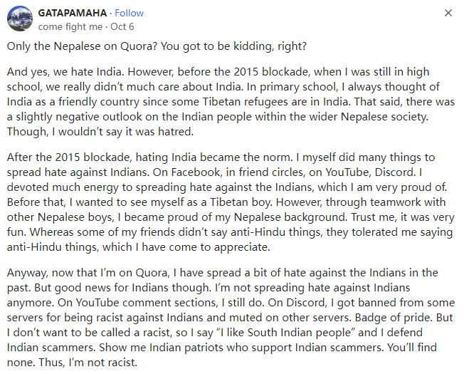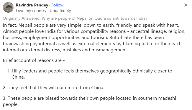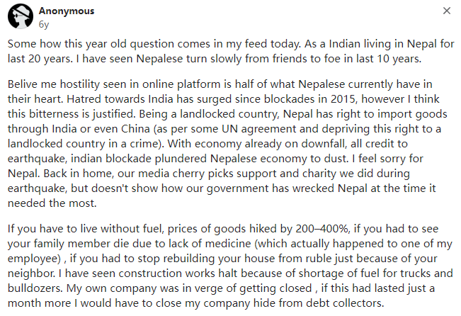 来源:https://www.quora.com/Why-are-Nepalese-on-Quora-so-anti-India-I-never-knew-that-Nepalese-citizens-had-such-hostile-attitudes-towards-India-until-I-read-on-Quora-Is-it-just-a-fringe-voice-or-is-there-a-real-momentum-of-hatred-towards-India-among-the-citizens-of-Nepal