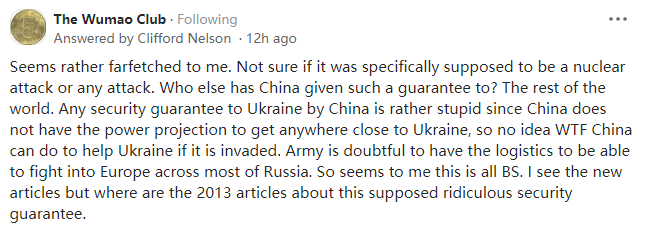 BS from University of Chicago我觉得似乎有些牵强。我不确定它针对的是一次核袭击还是任何其他袭击。中国还向世界其他地区的国家提供过这样的担保吗?中国对乌克兰的任何安全保证都是相当愚蠢的,因为中国没有能力将力量投射到乌克兰,所以如果乌克兰遭到入侵,中国根本无法帮助乌克兰。中国军队能否通过俄罗斯大部分地区向欧洲进军,这在后勤上是值得怀疑的。所以在我看来,这些都是胡说八道。我看到了新的协议,但2013年关于这种荒谬的安全保障的协议在哪里呢?