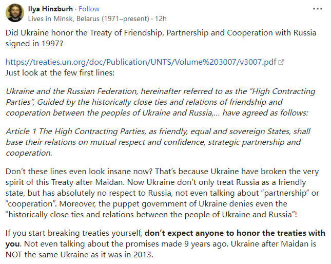 Lives in Minsk, Belarus (1971–present)乌克兰是否遵守了1997年与俄罗斯签署的《俄乌友好合作和伙伴关系条约》?https://treaties.un.org/doc/Publication/UNTS/Volume%203007/v3007.pdf乌克兰和俄罗斯联邦(以下简称“缔约方”)在乌克兰和俄罗斯两国人民在历史上的密切关系和友好合作关系的指导下,……达成如下协议:第一条 作为友好、平等和拥有主权的国家,缔约各方应将相互尊重和信任、战略伙伴关系与合作作为其关系的基础。这些话语现在看起来难道不疯狂吗?这是因为乌克兰在广场革命之后破坏了该条约的精神。现在乌克兰不仅不把俄罗斯视为友好国家,而且完全不尊重俄罗斯,甚至不谈论“伙伴关系”或“合作”。此外,乌克兰傀儡政府甚至否认“乌克兰人民与俄罗斯人民之间在历史上的密切关系”!如果你自己带头违反条约,就不要指望任何人会和你一起遵守条约,甚至不要谈9年前的承诺。广场革命之后的乌克兰与2013年的乌克兰不是同一个乌克兰。《乌俄友好条约》也称为《乌俄两国友好合作伙伴关系条约》,是俄罗斯与乌克兰签订的条约。条约于1997年签订,1999年生效,根据条约规定,两国承认苏联时期划分的俄乌边界,互相尊重领土完整,并同意通过用和平方式解决一切争端。该条约还确认克里米亚半岛归乌克兰所有,在当时缓和了双方的紧张关系。2018年12月6号,乌克兰最高拉达,也就是议会通过了终止《乌俄友好条约》的决议。《乌俄友好条约》于2019年4月1号失效。2018年12月10日,乌克兰总统波罗申科签署了关于乌方决定不再延长乌俄友好、合作和伙伴关系条约(乌俄友好条约)的法律文件。