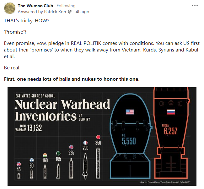M Sc from The United Kingdom即使是现实政治中的承诺、誓言和保证等也都是有条件的。你可以先问问美国,当他们离开越南、库尔德地区、叙利亚和喀布尔时,他们的“承诺”是什么。首先,一个国家需要很多核武器来确保拥有兑现承诺的能力。
