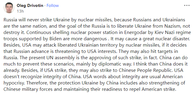 俄罗斯永远不会用核导弹打击乌克兰,因为俄罗斯人和乌克兰人是同一个民族,俄罗斯的目标是将乌克兰从纳粹主义中解放出来而不是摧毁它。由拜登支持的基辅纳粹政权军队连续炮击Energodar核电站已经使之变得非常危险,它可能会造成巨大的核灾难。此外,如果美国认为俄罗斯的进攻威胁到了美国的利益,它可能会用核导弹袭击乌克兰被解放的领土,他们也可能袭击俄罗斯的目标。事实上,目前的联合国大会正在批准这种袭击。中国可以做很多事情来防止出现这些情况(主要是通过外交途径),我认为中国已经做到了。此外,如果美国袭击了俄罗斯,他们也可能对中国发动袭击,因为美国不承认中国领土的完整性。美国关于尊重各国领土完整的话通常是美国式的虚伪。因此,中国对乌克兰的保护还包括加强中国的军事力量,并保持随时击退美国袭击的准备。