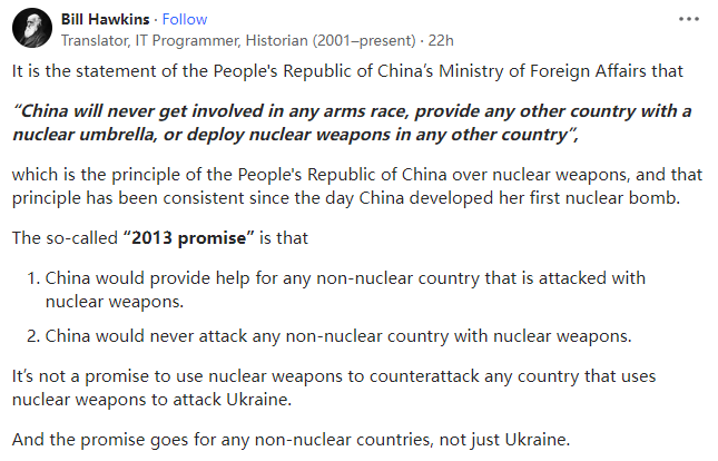 Translator, IT Programmer, Historian (2001–present),Lives in Cherry Hill, NJ2010–present翻译,IT程序员,历史学家(2001年至今),2010年至今生活新泽西州Cherry Hill“中国永远不会参与任何军备竞赛,不会为任何其他国家提供核保护伞,也不会在任何其他国家部署核武器”。这是中华人民共和国在核武器问题上的原则,自中国研制出第一枚核弹以来,这一原则始终如一。1.中国将向任何遭受核武器袭击的无核国家提供帮助。使用核武器反击任何使用核武器袭击乌克兰的国家并不是一个承诺。中国的以上承诺适用于所有无核国家,而不仅仅是乌克兰。