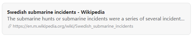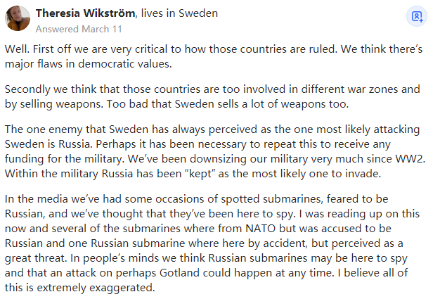首先,虽然我们认为民|主价值观存在重大缺陷,但我们对这些国家的统治方式非常挑剔。第二,我们认为这些国家通过出售武器过多地卷入不同的纷争,遗憾的是瑞典也卖了很多武器。瑞典一直认为最有可能攻击瑞典的敌人是俄罗斯。也许他们有必要重复这一点,以便为军队获得资金。因为自二战以来,我们一直在裁减军队,在军队内部,俄罗斯也被“保留”为最有可能入侵瑞典的国家。在媒体上,我们有过一些被发现的潜艇的新闻,我们担心那是俄罗斯的潜艇,我们认为他们是来侦察的。我现在正在读这篇文章,其中几艘潜艇来自北约,但被指控是俄罗斯的,还有一艘俄罗斯潜艇是偶然出现在这里的,但被认为是一个巨大的威胁。在瑞典人的心目中,我们认为俄罗斯的潜艇可能在这里进行间谍活动,对哥得兰(Gotland,瑞典最大的岛屿)的袭击可能随时会发生。但我认为这一切都是极其夸张的。在这里你可以阅读有关潜艇的资料,也有一个瑞典语版本供瑞典读者阅读。我想瑞典军队非常需要一个敌人才能生存。现在我相信有一个转变正在进行,我们认为瑞典军队更像是一支援助部队,可以在世界各地的动乱地区提供援助——但是,如果要在很大程度上保持国内军队的安全,我们就需要来自俄罗斯的威胁。从历史上看,现在许多瑞典人仍然相信俄罗斯可能会在某个时候入侵。说到中国,我没什么好说的。我相信我们与中国做了很多生意,我们对中国的看法并不重要。中国对我们来说太远了,我们提供不了什么重要的意见。