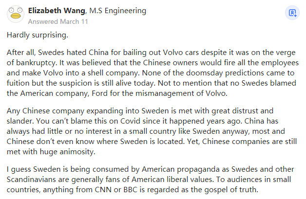 毕竟,瑞典人痛恨中国救助了沃尔沃汽车,尽管它濒临破产。据信,中国老板将解雇所有员工并将沃尔沃打造成一家空壳公司。虽然世界末日的预言没有一个得到证实,但这种怀疑在今天仍然存在。更不用说没有瑞典人会指责美国公司福特对沃尔沃的管理不善。任何一家进军瑞典的中国公司都会遭到极大的不信任和诽谤,这些事发生在几年前,你不能怪新冠病毒。中国对瑞典这样的小国一直没有什么兴趣,大多数中国人甚至不知道瑞典在哪里。然而,中国企业仍然遭到巨大的敌意。我猜瑞典正在被美国的宣传所吞噬,因为瑞典人和其他斯堪的纳维亚人通常都是美国自|由|主义价值观的粉丝。对小国的听众来说,CNN或BBC的任何节目都被视为真理的福音。历史上,俄罗斯曾多次与瑞典交战,它在1809年占领了瑞典一半的领土。他们对我们的城市和类似的地方进行(核)炸弹袭击也无助于瑞典建立对其的好感。小国没有独立的记者。他们经常依赖路透社、BBC、美联社或任何来自盎格鲁媒体的消息。这是可以理解的,因为满世界驻扎记者是非常昂贵的。首先,瑞典是一个相对富裕的国家,瑞典的媒体公司在世界各地都有记者。太神奇了!我们有自己的宣传机器,我们不需要别人的,也就是说,你的回答的那部分存在根本上的缺陷。此外,如果“大多数中国人”不知道“小国瑞典”在哪里,那说明中国比瑞典更重要。有几千中国人在瑞典过着幸福安详的生活,我可以给你介绍几个,其中一个是我的私人密友,你那种咄咄逼人、愤怒的回答对他们没有任何好处。你的答案只有两个部分是准确的。是的,瑞典工人害怕失去工作,因为外国所有者(中国人或其他人)逐渐收购了沃尔沃。你真的能责怪他们吗?100年前有100万瑞典人移民到北美也是事实,所以正如你所说的,瑞典与美国和加拿大有着长期的历史联系“并不奇怪”。瑞典是一个拥有1000万人口的小国(与中国的二线城市差不多),像我这样的少数人知道瑞典已是勉为其难,普通的中国人为什么会对这个国家感兴趣呢?这同样适用于美国。我曾和美国人谈论过瑞典,他们告诉我,“是的,我知道瑞典,它是那个和海蒂及阿尔卑斯山有关的国家(译注:这里的海蒂和阿尔卑斯山应该是来自电影《Heidi》,这部电影有1993年和2015年两个版本,非常好看)。”我很欣赏你的意见,Antonie,但我不同意。她的回答粗鲁、咄咄逼人、有点偏执,而且在许多方面都是不正确的。讽刺的是她还表现出了居高临下的优越感。瑞典可能是一个人口小国,但它是世界上最现代化、最先进、最有见识和最进步的社会之一。它在许多方面,比如可持续性、两性平等和基层民主上领先中国好几英里。我们不必窃取别人的想法、概念、品牌和知识产权来实现上述目标。你提到美国与此并不相关。我回答的是“大多数中国人甚至不知道瑞典在哪里”,我相信这是真的。但无知不是什么值得骄傲或者可以用来作为论据的事。仅仅因为一个人被无知包围并不意味着无知在每个国家都是普遍存在的。瑞典不是美国。