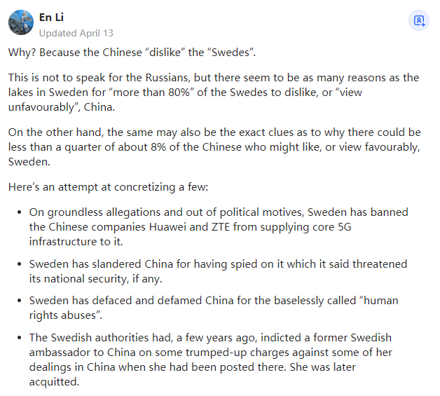 Ø 三分之二的瑞典人对中国持负面看法,近80%的瑞典人不信任中国。这些都是本报告中展示的全面的欧洲民意调查的结果。在被调查的13个欧洲国家中,中国的公众形象在瑞典最为负面。Ø 瑞典对中国的负面看法在一定程度上是一种新的发展。近60%的受访者表示,他们对中国的总体看法在过去三年有所恶化。Ø COVID-19大流行很可能是中国在瑞典的公众形象变得负面的原因之一。只有不到5%的受访者认为中国在危机期间帮助了瑞典,更少的人相信中国的国际声誉在大流行期间有所提高。Ø 然而,瑞典的对中国的负面看法在国际比较中脱颖而出,很可能与中国对待瑞典政府和瑞典公民的不满有关。此外,调查结果表明,对中国人权状况的关注也对瑞典对中国的看法很重要。这些担忧可能会使公众舆论向负面方向倾斜。Ø 尽管瑞典人对中国的看法普遍持批评态度,但调查并没有表明瑞典人呼吁对中国采取强硬态度或与中国脱钩。瑞典人认识到了中国对瑞典经济的重要性,欢迎与中国进行合作以应对全球挑战。此外,调查结果显示,瑞典民众对最近讨论的一些政策措施只有有限的支持,例如驱逐中国大使或结束与中国的友好城市的合作。Ø 同时,调查并没有表明瑞典人对与中国的各种合作持开放态度。例如,只有不到20%的人对与中国合作发展瑞典5G移动网络持积极态度。我的消息来源不是皮尤的报告,而是瑞典国际事务研究所的一篇论文,部分数据基于皮尤的这些调查结果。注意:这与“种族主义”毫无关系,一切都与中国更激进的地缘政治立场、对HK的做法以及所谓的W人的强|迫|同|化有关。更不要提俄罗斯人了,但似乎有很多原因使瑞典“ 80%以上”的瑞典人不喜欢或“不赞成”中国。另一方面,也可能有同样确切的原因,说明为什么只有不到四分之一或8%左右的中国人可能喜欢或看好瑞典。Ø 基于毫无根据的指控和政治动机,瑞典禁止中国公司华为和中兴向其提供5G核心基础设施。Ø 瑞典诽谤中国对其进行间谍活动,并称这威胁到了瑞典的国家安全(如果有的话)。Ø 瑞典无端污蔑和诽谤中国所谓的“侵|犯|人|权”。Ø 几年前,瑞典当局以一些捏造的交易起诉了一名前瑞典驻华大使,她后来被无罪释放。Ø 瑞典肆意干涉中国的内政,干涉中国香港特区和台湾省的事务。Ø 三年前,大约80%的瑞典人每晚都会观看一些讽刺性的电视节目,这些节目尖刻地嘲笑在瑞典的中国游客。Ø 虽然瑞典指责中国没有像瑞典那样的“基本价值观”,但瑞典没有意愿也没有计划试图相应地调整自己的价值观。Ø 瑞典服装公司H&M刚刚在全世界散布了中国XJ棉花采摘强|迫|劳|动的谣言,以此诽谤中国。因此,超过80%的瑞典人不喜欢中国,但超过97%的中国人可能鄙视瑞典。former Financial Writer, Geopolitical Writer, Wealth Mgr,Lives in Asia1970–present