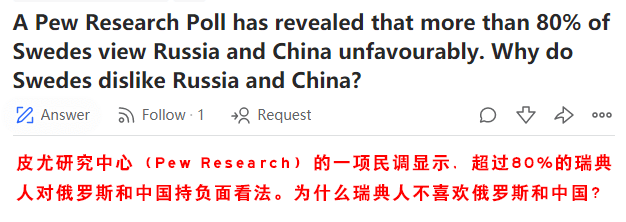 本文译自Quora,原标题:A Pew Research Poll has revealed that more than 80% of Swedes view Russia and China unfavourably. Why do Swedes dislike Russia and China?