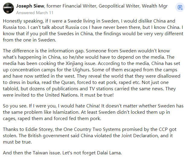 前财经作家、地缘政治作家、财富经理,1970年至今生活在亚洲老实说,如果我是住在瑞典的瑞典人,我也不喜欢中国和俄罗斯。我无法谈论俄罗斯,因为我从未去过那里,但我了解中国。我知道,如果你在中国对瑞典人进行民意调查,结果将与在瑞典的结果大不相同。区别在于信息鸿沟。瑞典人不知道中国发生了什么,所以他/她只能依靠媒体来获取信息。瑞典的媒体一直在炒作XJ问题。这不仅仅是一家小报这么说,几十家出版物和电视台都刊登了同样的消息。他们还被邀请到联合国作证,所以这一定是真的!多亏了Eddie Storey,中供承诺的一国两制被食言了。英国政府说,中国违反了《中英联合声明》,这肯定是真的。