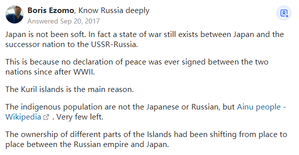 日本并不软弱。事实上,日本和苏俄的继承国之间仍然处在战争状态。千岛群岛上的土著居民不是日本人或俄罗斯人,而是阿伊努人——维基百科,不过现在已经所剩无几了。群岛不同部分的所有权一直在俄罗斯帝国和日本之间转移。1918年至1925年,日本人、美国人和其他人利用北千岛群岛作为入侵俄罗斯堪察加半岛的基地。在1951 年的旧金山条约 - 维基百科中,日本被命令放弃对千岛群岛的所有主张,他们也这样做了。不过千岛群岛没有正式移交给苏联,但是考虑到苏联已经实际控制了它们,日本什么也做不了。日本不主张千岛群岛的主权,他们早在1951年就放弃了所有主张。他们主张的是千岛群岛最南部的几个小岛不是千岛群岛岛链的一部分,而是大陆的一部分,因此不在条约的范围之内。当然,就像对中国一样,日本无法针对俄罗斯进行任何军事对抗。阿伊努人是北海道本地人,他们是日本的原始居民,移居到了北海道。他们中还有一些人生活在萨哈林岛,也许还有阿拉斯加。太好了,现在你已经给了日本一个理由,将来它也可以声称拥有阿拉斯加。“这是因为自二战以来,两国之间从未签署过和平协议。”这并不意味着战争没有因为日本宣布无条件投降而结束。日本与俄罗斯之间的条约最早是在1855年签订的,条约内容包括千岛群岛四个最南端的岛屿是日本群岛的一部分。而日本作为旧金山条约的参与者同意放弃对“千岛群岛”的主张,这被认为是放弃了对千岛群岛所有岛屿的声索。但日本仍然主张其拥有最南端的4个岛屿。如果他们在讨论千岛群岛的所有权问题,那么为什么要提及不涉及的岛屿呢?她自己不能,但如果美国跟她一起(事实上,美国对日本的主权负有义务),他们可以把俄罗斯在整个太平洋上微不足道的存在炸成碎片。