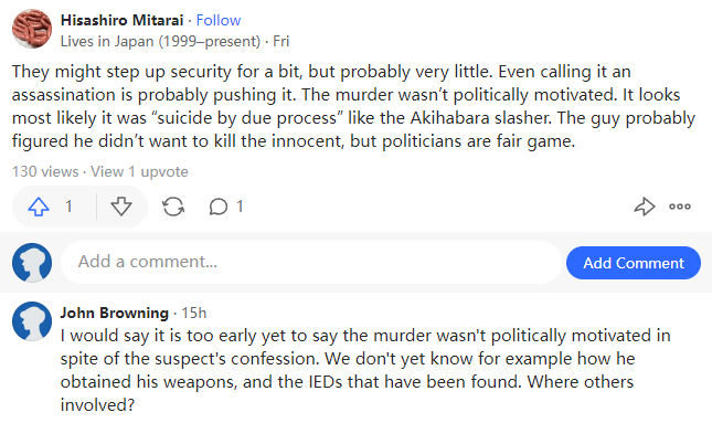 他们可能会加强一些安全措施,但可能不会太多。甚至称之为暗杀也可能是在鼓励它。这起谋杀案并非出于政治动机,看起来很可能是“正当程序自杀”(suicide by due process),就像“秋叶原杀人事件”一样。这个家伙可能认为他不想杀害无辜者,但杀害政客是公平的。译注:秋叶原杀人事件,是指在日本当地时间2008年6月8日下午12时30分在东京都千代田区秋叶原所发生的随意杀人事件,犯人为25岁的男性加藤智大,事件共造成7死10伤。