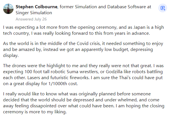 Singer Simulation的前模拟和数据库软件,生活在澳大利亚首都堪培拉我对开幕式抱有更高的期望,因为日本是一个高科技国家,我真的很早就开始期待了。当全球处于大流行的危机之中时,我们需要一些可以享受和感到惊讶的东西,但是相反,我们得到了一个明显低预算,令人沮丧的秀。对我来说,无人机是个亮点,但它们真的没有那么棒。我期待着100英尺高的相扑机器人摔跤手,或者像哥斯拉一样的机器人互相搏斗,还有激光和未来派的烟火。我相信泰国人可以以东京千分之一的成本展示一场精彩的表演。我真的很想知道在世界感到沮丧、不安,并且对可能发生的事情感到失望之前,最初的计划是什么。我希望闭幕式能更合我的意。