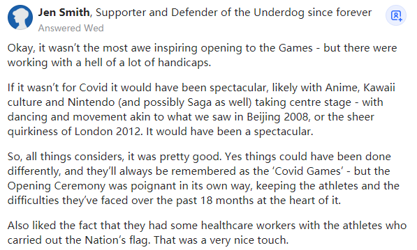 好吧,这并不是奥运会历史上最令人振奋的开幕式,但是它是在很多不利因素的情况下完成的。如果不是因为新冠病毒,它将会很壮观,很可能会由动漫、卡瓦伊文化和任天堂(也可能是Saga)占据中心舞台——舞蹈和动作与我们在2008年北京奥运会上看到的类似,或者像2012年伦敦奥运会上那样古怪。但它将是壮观的。所以,从各方面考虑,它已经相当好了。是的,事情本来可以做得不同,因为它们将永远由于被称为“新冠病毒运动会”而被人们记住——但开幕式以其独特的方式让人心酸,他们把运动员和他们在过去18个月里所面临的困难放在核心位置。我喜欢他们有一些医护人员和运动员一起举着国旗入场,这是一个非常好的创意。