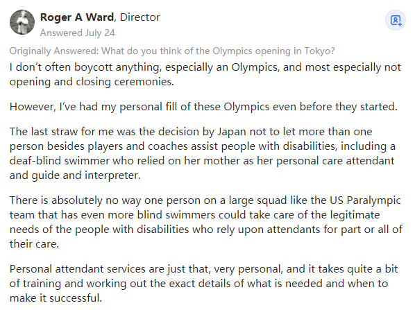 我并不经常抵制任何东西,特别是奥运会,尤其是开幕式和闭幕式。然而,在奥运会开始之前,我就已经对这届奥运会有了充分的了解。对我来说,最后一根稻草是日本决定除了运动员和教练之外,不让其他人帮助残疾人,包括一名依赖母亲作为个人护理人员和导游翻译的聋盲游泳运动员。像美国残奥会这样一支拥有更多盲人游泳运动员的庞大队伍中,绝对没有任何一个人有能力照顾残障人士的合法需求,他们的部分或全部护理都依赖于服务人员。私人助理服务就是这样,非常私人化,它需要大量的培训。如果允许这些服务员帮助残疾人很危险,那么要求运动员自己参加比赛可能更危险。还有很多问题,比如消费女性,因为一些男性体育官员已经垂涎三尺,他们认为女子沙滩运动进行的日子就是他们的胜利日(VJ Day)。消费女性,因为一些男性体育官员已经垂涎三尺,因为他们认为女子沙滩运动进行的日子就是他们的胜利日(VJ Day)挪威女子沙滩手球队因穿着短裤而非规定的比基尼底裤(要求宽度小于6厘米,贴身裁剪且向上切向大腿顶部)而被罚款1500欧元。她们想穿和男人一样的短裤,以显得更庄重,她们想专注于运动而不是被人盯着裤裆看。哦,是的,我昨天在报纸上看到了,关于Pink(不记得她叫什么名字)愿意支付罚款的新闻。这不是与欧洲冠军赛有关吗,东京奥运会也这样?是的,但正是联合会拒绝改变这一规定,而且也不允许在奥运会上穿短裤。老男人们利用剥削女性和挑逗来控制体育运动真是令人作呕。