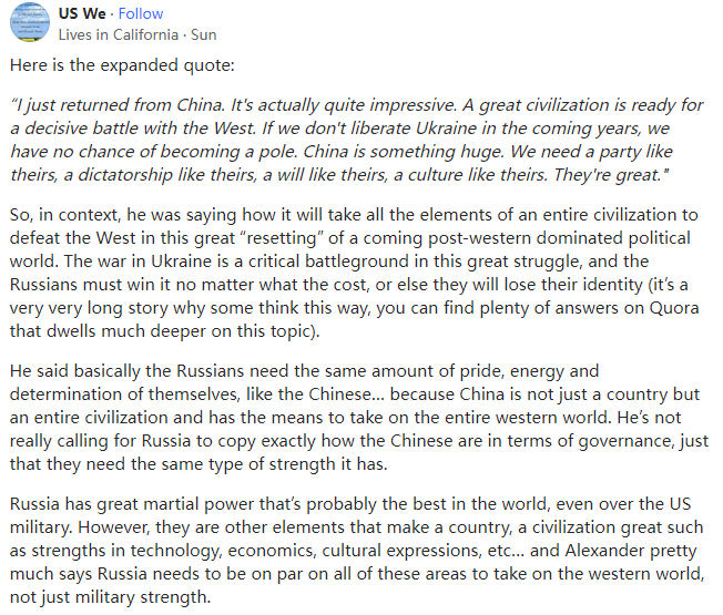 因此,从上下文来看,他是在说在即将到来的后西方主导的政治世界的伟大“重置”中,需要如何利用整个文明的所有元素来打败西方。乌克兰战争是这场伟大斗争中的一个关键战场,俄罗斯人必须不惜一切代价赢得这场战争,否则他们将失去自己的身份(有些人为什么会这么想,说来话长,你可以在Quora上找到很多关于这个问题的更深入的答案)。