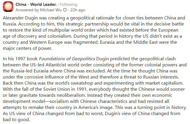 来源:https://www.quora.com/Why-did-Alexandar-Dugin-sayChina-is-a-great-civilization-ready-for-a-decisive-battle-with-the-West