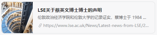 译注:这里只有一个链接,因前面一直有人提到“伦敦政治经济学院关于蔡英文博士的博士学位的声明”,所以这里把链接的内容翻译一下如下:伦敦政治经济学院(LSE)收到了许多关于我们的校友蔡英文博士的学术地位的询问。我们可以清楚地看到伦敦政治经济学院和伦敦大学(当时的学位授予机构)的记录,证实蔡博士于 1984 年获得了法学博士学位。这一时期的所有学位都是通过伦敦大学颁发的,论文将首先被送到伦敦大学图书馆。伦敦大学图书馆的记录证实,他们收到了一份副本并将其发送给IALS。1985年出版的IALS索引文件“1905-1984年英国法律研究”中列出了蔡博士的论文“不公平的贸易惯例和保障措施”。蔡博士最近向伦敦政治经济学院图书馆提供了论文《不公平的贸易惯例和保障措施》的个人副本的传真件,可在图书馆阅览室查看。据我们所知,蔡博士还向台湾地区中央图书馆提供了其个人副本的数字版。