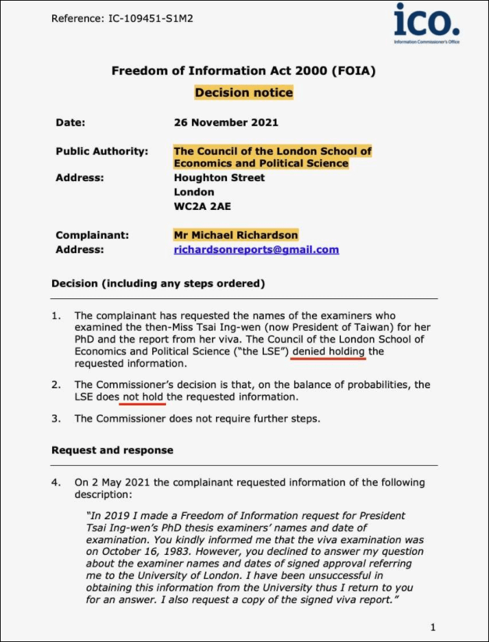 网文来自网友原文翻译投稿,所有言论皆不代表本站立场 | 本文文字/图片来自网络,侵删 | 点击页眉也可刷新 | 本文内容仅供娱乐,不作任何严肃之用途谜之博士学位!蔡英文到底是不是伦敦政经学院的法学博士?本文译自Quora,原标题:Why doesn't the London School of economics have a record of Tsai Ing-wen's (Taiwan's President) oral defense of her PhD thesis?据台湾“中时新闻网”、《雅虎新闻》台湾版(tw.news.yahoo.com)11月29日报道,该事件日前又有堪称“震撼弹”级别的新进展:美国波士顿《观察家报》前专栏作家迈克尔·理查森(Michael Richardson)26日接获英国资讯委员会办公室(ICO)的判决文书,内称伦敦政治经济学院(LSE)“否认持有”蔡英文论文口试委员名单以及口试报告。结合此前消息,长期关注此事的美国北卡罗来纳大学经济学系副教授林环墙表示,LSE去年还曾向台湾法务部门提供“2名博士口试委员的名单”,如今又否认,无疑间接承认该校内部有一撮人在里应外合提供造假文件,配合蔡英文掩饰诈骗博士学历的跨海串供。11月28日,此前一直追查蔡英文“论文门”的台湾深绿媒体人彭文正,也在其网络政论节目《政经关不了》中,透露了理查森所收到的判决文件以及LSE的否认说法。本月初,彭文正曾在接受采访时表示,自己被蔡英文当局追杀,已申请入籍美国,并委托律师向美国申请“政治庇护”。而随后,岛内检方也已正式递状申请拘提、通缉彭文正,法官正在审酌中。11月28日晚间,台湾地区前“立委”、台湾中国文化大学教授邱毅在社交平台发文称,蔡英文的“博士论文门”首度有了法院公文书的认证,其博士学位的真假“十之九点九”有了答案,这个结果非常严重,主要在三个层面。一是法律层面,蔡英文自1984年以来申请副教授、教授升等,均涉及伪造文书,并诈领薪资涉嫌犯下贪污罪,而她明知博士学位为假,还控告彭文正等人,使彭文正被起诉和通缉,也涉嫌犯诬告罪。二是道德层面,蔡英文30多年来一路欺诈,在大学里获得教职,在行政部门获得公职,最后担任领导人,位高权重,成为了社会最恶劣的负面形象。三是政治层面,蔡英文假冒博士取得社会认同,应当负起政治责任,即刻宣布辞职下台。论文答辩和论文都必须由通常包括其导师在内的审查团队签字。只有在提交这些记录并经系主任和院长批准后,才能授予学位。一旦授予学位,论文的实物副本将被归档在学校图书馆,作为对其研究成果的正式认可。伦敦政治经济学院是一所老牌院校。当蔡在上世纪80年代进入学校时,他们颁发学位的历史已经有100年了。向学校提出的一个更好的问题是,在同一个十年里,有多少学生获得了无法被追踪的博士学位,不过这个问题可能是没人想碰的麻烦(a can of worms)。任何学位的授予都是一个严格的、正式的过程,它会生成一个山一样高的书面记录。我对这些被揭露的事情感到不安。蔡的博士论文的数字副本于2019年由蔡英文提供,可从网站下载[蔡英文2019年提交给图书馆的原始论文个人副本的数字副本《不公平的贸易惯例和保障措施》]-伦敦商学院在线论文(链接)。她的导师是一位真实的人物(“Michael J Elliott”),一位法律和政治学学者。你可以阅读他的一些论文和书籍的摘要:示例1:《是时候进行新的宪法改革了》(Time for a New Constitutional Change)示例2:《Schleswig‐Holstein的地方政府-侵犯法律》?“任何学位的授予都是一个严格的、正式的过程,它会生成一个山一样高的书面记录。我对这些被揭露的事情感到不安。”论文答辩不是很重要。尽管我自己的论文可以通过简单的谷歌搜索下载,但我找不到2011年我自己的博士论文答辩的在线记录。伦敦政治经济学院关于蔡英文博士的博士学位的声明(链接)伦敦政治经济学院澄清,蔡英文的论文的记录可在1985年出版的IALS索引文件“1905-1984年英国法律研究”中找到,这本书在大学图书馆就有。要证明这篇论文是假的很容易:只要看看在这本书中是否真的存在这篇论文的记录就可以了。事实上,有人已经拍下了1985年出版的那本书的书页。你可以在这里查阅:蔡英文的博士论文,收录在索引书《1905-1984年英国法律研究》中,伦敦大学国际法律学院(IALS)(链接)。该论文最近由蔡英文以数字形式提供给学校,但它的标题与记录中的标题不同。“该论文最近由蔡以数字形式提供给学校,但它的标题与记录中的标题不同,无法找到。”伦敦政治经济学院的网页上的标题是“不公平的贸易惯例和保障措施”(Unfair trade practices and safeguard actions)。如果这篇论文被存档了,那么实体副本在哪里?他们的图书馆里连战前的资料都有,怎么会没有上世纪80年代的资料?她所谓的论文是用中文写的吗?据我所知,她的全名的意思是“英语很差”(菜英文)。哈哈。说真的,她的英语有好到可以在高中考试及格吗?