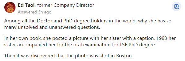 在世界上所有的博士和博士学位获得者中,为什么只有她有这么多未解决和未回答的问题。在她自己的书中,她贴了一张和姐姐的合影,并配文说明:1983年,她的姐姐陪她参加了伦敦政治经济学院博士学位的答辩。伦敦政治经济学院有一份学生记录表,表上显示她休学了(quited the course)。然而,这个学生记录表还有自相矛盾的地方,不仅论文的标题被修改了,与她现在出示的记录不同。备注中还说她在1982年11月10日休学了,但为什么在另外一个条目中提到在1984年2月授予了她学位。就连她参加的课程也从硕士学位改成了博士学位。对于一份有如此之多的修改之处的学生记录来说,这是非常不寻常的。到目前为止,她已经制作了3份不同的博士证书副本,但在伦敦政治经济学院的规章制度中明确规定,学校只会颁发1份副本。在过去的采访中,她提供了自己的博士生导师的姓名,但后来被人发现这些人只拥有硕士学位,并不能胜任博士生导师的工作。所有这些似是而非的事件加在一起,她是否有参加过博士论文答辩是相当令人怀疑的。