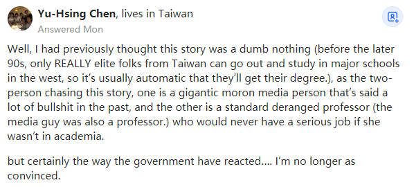好吧,我以前认为这件事是一个愚蠢的无稽之谈(因为在上世纪90年代后期之前,只有真正的台湾精英人才可以到西方的主要学校学习,所以他们通常能自动拿到学位),但作为这个故事的两个主人翁,一个是过去胡说八道的大白痴媒体人,而另一个是如果不在学术界,则永远不会有一份严肃的工作的标准的精神错乱的教授(那个媒体人也是教授)。
