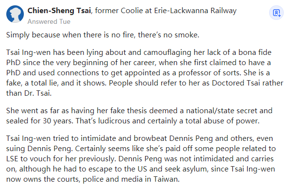 因为无风不起浪(there is no fire, there’s no smoke)。蔡英文从职业生涯一开始就一直在撒谎和掩饰自己没有真正的博士学位,当时她第一次声称拥有博士学位,并利用人脉关系获得了某种教授职位的任命。她是个骗子,一个彻头彻尾的谎言。人们应该称她为造假蔡(Doctored Tsai),而不是蔡博士。她甚至将她的假论文视为国家机密并封存了30年。这太荒谬了,无疑是在滥用权力。蔡英文试图恐吓和威胁彭文正等人,她甚至威胁要起诉彭文正。显然,她似乎已经付钱给了一些与伦敦政治经济学院有关的人来为她以前的经历作证。尽管彭文正不得不逃到美国寻求庇护,因为蔡英文现在拥有台湾地区的法院、警察和媒体,但他没有被吓倒,他继续在战斗。据说,鉴于伦敦政治经济学院最新披露的信息,媒体及时曝光了民进党女立委高嘉瑜被民进党网军运营者林秉枢虐待的争议,以分散民众的注意力。