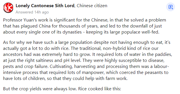 袁教授的工作对中国人来说意义重大,因为他解决了一个困扰中国几千年并导致了中国几乎每一个朝代垮台的问题——让广大民众吃饱饭。至于为什么尽管没有足够的食物,而我们却有这么多的人口,这实际上与大米有很大关系。我们祖先的传统的非杂交水稻非常难以种植,它在稻田里需要大量的水,需要适当的咸度和pH值水平。它们极易受到病虫害和作物歉收的影响。种植、收获和加工是一个劳动密集型的过程,期间需要大量的人力,这就迫使农民必须生育大量的孩子,这样他们可以帮忙从事农活。或者说“干米饭”,是只有富人才吃的东西。对于大多数农民来说,稀饭粥已经是他们最好的食物了:加更多的水意味着你可以泡发它,用更少的大米养活更多的人。但正如你所能想象的,这些东西很难填饱肚子,这就是为什么人们总是饥饿和营养不良。去博物馆看看古代的衣服和盔甲——我们的祖先比我们现在矮得多,瘦得多。饥饿——更重要的是,对饥饿的恐惧——在我们的文化中根深蒂固,它们的影响已经刻进了我们的集体心理、我们的文化记忆,甚至我们使用的语言。国外打招呼一般会说“天气怎么样?”,但我们一般会说“你吃饭了吗?”。当中国孩子试图追求与学业无关的爱好或非传统职业时,我们的父母首先会问我们:“这个可以当饭吃吗?”如果你问这里的老人为什么喜欢毛泽东,他们会说“因为他让人民吃饱了饭”。我们的这种心态和文化是我们的可耕地大约只占全世界的7%,而且主食作物只在某些地区生长,但我们必须养活地球上五分之一的人口的产物,。袁教授的杂交水稻容易种植,产量很高,而且对病虫害有很强的抵抗力,这让中国人民在历史上第一次不怕挨饿,现在每顿饭都是干米饭,我们甚至都没想过自己和祖先相比有多幸运。如果你想知道为什么中国人民支持“邪恶的”GC党,你所要做的就是看看中国自1949年以来的平均卡路里摄入量,它一直在迅速上升。没有GC党政府,这是不可能发生的。有效的治理会导致一个和平、安全和进步的社会,有利于科学研究(如袁教授的研究)、农业、工业、社会发展和幸福。在政治方面,中国人非常务实,花哨的词语和“主义”对我们没有什么吸引力。我们有一个更简单、更可靠的指标来衡量任何一个皇帝或王朝的成就和功绩——他们统治下的人民是否吃得更好。你看,要想让农民要吃得好,就得将惯于掠夺的外国军队拒之门外,还要围剿土匪和军阀,把地主、官吏、地方贵族都控制住,不让他们占有农民太多的收成。中国历史上只有一个政府能够同时做到这一切。诺贝尔和平奖不过是斯堪的纳维亚政治家向世界展示他们对世界并非完全无关紧要的政治工具,这一点现在应该是众所周知的了。我以前写过这方面的文章,但一个强大、健康和进步的中国对斯堪的纳维亚半岛来说是个坏消息。发达国家(包括北欧)要保持繁荣,其他发展中国家(包括中国)就必须保持贫穷、不发达和饥饿的状态。这就是为什么他们要攻击和妖魔化中国的一切,包括我们的政府,我们的历史,我们的文化,我们的人民,我们的生活方式等等。这就是为什么他们总是试图制裁我们,抵制我们的产品,并向我们抛出任何他们能够想出的疯狂的指控。这就是为什么他们永远不会把这个奖项颁给像袁教授这样真正让世界变得更美好的人。见鬼,由于碳排放和诸如此类的借口,如果他们有办法,他们甚至会要求我们吃草而不是米饭。我们不在乎他们的诽谤,也不需要他们的赞美。我们会以自己的方式纪念袁教授,每当一个中国人在午餐和晚餐时发现有足够多的米饭时,他的遗产就会受到尊重。每吃一口米饭,每一次满意的打嗝,我们每一年都在延长的寿命——这些都比任何虚假的奖章或奖励都要好。就像我们对饥饿的恐惧一样,你可以在我们使用的语言中找到他的遗产。比如当有人做了或说了一些非常愚蠢的事情(通常是在TikTok/Douyin上,因为他们可能有太多的空闲时间或精力)-你可以通过一个段子来表达:“这是袁隆平的错,他让你们吃得太饱了”。我必须承认我从来没听说过他,但通过你的回答,我必须说他是个伟大的人。如果他出生在另一个国家,做了他所做的事,他将得到同样的荣誉,无论他是否获得了诺贝尔和平奖。诺贝尔奖与农业无关,我认为它只有物理、化学、文学、医学和和平五个大类。这与诺贝尔本人的职业生涯和个人喜好有很大关系,因为他是一个发明炸药的化学家。这就是为什么他认为这些奖项与他的职业生涯有很大关系。诺贝尔奖对科学家来说是一个真正的荣誉,但和平奖现在是一个笑话。看看最近几年的提名,他们已经把一切都政治化了。袁教授是一位成就斐然的伟人,他不需要西方的奖励或认可,中国人民以及那些遭受过饥饿的人将永远记住和爱他。诺贝尔和平奖提名者轰炸或扰乱整个世界,制造噪音以引起注意,而袁教授试图找到养活每个人的方法,但却没有多少人认识他,很讽刺,对吗?是的,他们确实会对农业成就给予奖励。猜猜谁先拿到的?美国植物科学家Norman Borlaug在小麦种植方面取得了突破性进展,并于1970年获得“那个”和平奖。他的工作是在50-60年代完成的,并在随后的十年里立即获得了该奖项,你可以在纽约时报上读到这个。小麦主要是欧洲人的主食,所以除非你的发现首先能使他们受益,否则你可以忘记他们的任何奖项