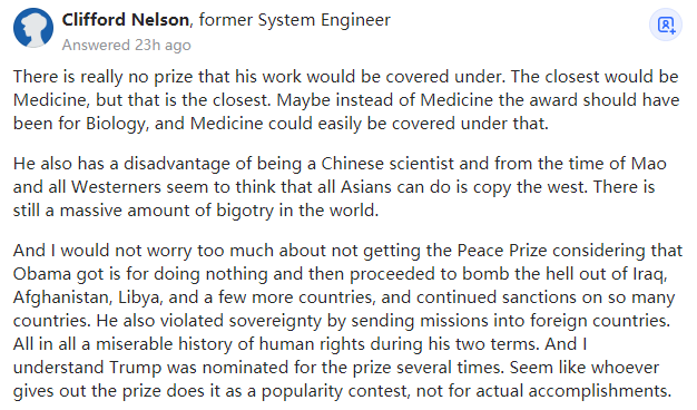 他的成就在诺贝尔奖里确实没有什么奖项可以涵盖,最接近的是医学奖,但那只是最接近的。也许这个奖应该颁给生物学而不是医学。作为一名中国科学家,他还有一个不利之处,即从毛泽东时代起,所有西方人似乎都认为亚洲人所能做的就是模仿西方,这个世界上仍然存在大量的偏见。我不会太担心他会得到和平奖,因为奥巴马什么好事都没做就得奖了,之后他开始轰炸伊拉克、阿富汗、利比亚和其他几个国家,并继续对许多国家实施制裁。他还向外国派遣使团,侵犯别国的主权。总之,在他的两个任期内的人权史是悲惨的。据我所知,特朗普曾多次被提名获奖,似乎这个将不管颁给谁都只是因为人气竞赛,而不是因为实际的成果。