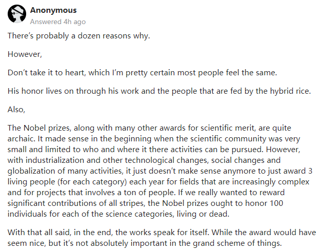 他的荣誉通过他的工作以及靠杂交水稻养活的人民而永存。诺贝尔奖,连同其他许多科学成就奖,都早已过时了。一开始,科学界的规模很小,这些奖项是有意义的。然而,随着工业化和其他技术变革、社会变革和许多活动的全球化,每年只为日益复杂的研究领域和涉及大量人员的项目奖励3名活着的人(每个类别)已不再有意义。如果我们真的想奖励各行各业的重要贡献,诺贝尔奖应该在每一个科学类别中奖励100个人,包括生者或已经去世的人。话虽如此,但最终,成果不言自明。虽然这个奖看起来不错,但它在整个计划中并不是绝对重要的事情。