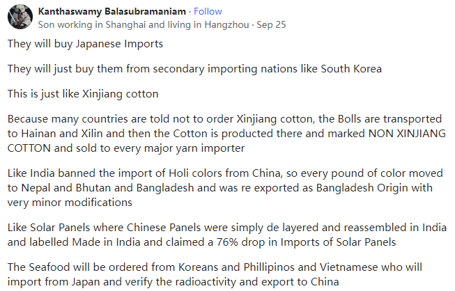 Kanthaswamy BalasubramaniamSon working in Shanghai and living in Hangzhou,Lives in Chennai, Tamil Nadu, India儿子在上海工作,住在杭州,生活在印度泰米尔纳德邦金奈因为许多国家被告知不要订购新疆棉花,因此新疆的棉铃被运到海南(译注:应该是指青海海南藏族自治州)和西宁,然后在那里生产棉花并标上非新疆棉再卖给各大纱线进口商。就像印度禁止从中国进口胡里节(Holi)色粉一样,因此所有色粉都被运到尼泊尔、不丹和孟加拉国,稍作改动后以孟加拉国原产色粉的名义重新出口。就像太阳能电池板,中国的电池板在印度被简单地拆解和重新组装,贴上“印度制造”的标签并声称来自中国的太阳能电池板的进口量下降了76%。