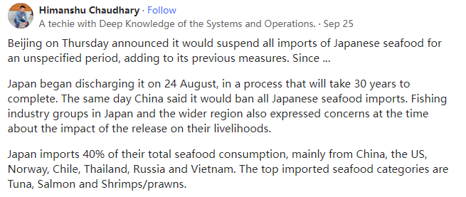这是日本对其他亚洲国家的又一次公然蔑视,让人想起了二战时日本对亚洲邻国的暴行。中国仍然非常务实,虽然它们可能并不希望破坏其食品供应链,但我认为它们对摧毁日本的海洋产业是认真的。与其说是出于健康考虑,还不如说是出于政治考虑。日本站在美国一边,禁止向中国出口半导体材料和设备。与此同时,日本故意打出台湾牌来惹恼中国并不断将其供应链撤出中国。日本选择敌视中国并开始阻碍中国的发展,这就是地缘冲突。