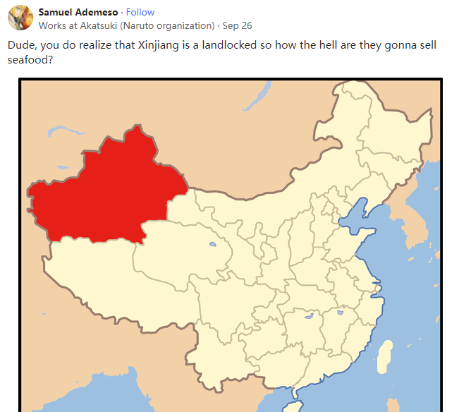 Works at Akatsuki (Naruto organization),Lives in Lagos, Nigeria供职于Akatsuki(火影忍者组织),生活在尼日利亚拉各斯老兄,你知道新疆是内陆地区吧,他们怎么能卖海产品呢?