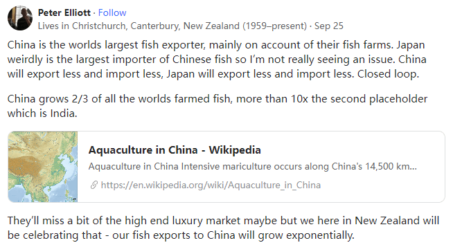 Lives in Christchurch, Canterbury, New Zealand (1959–present)中国是世界上最大的鱼类出口国,这主要归功于他们的养鱼场。奇怪的是日本是中国水产品的最大进口国,所以我觉得这不是什么问题。中国将减少出口和进口,日本将减少进口和出口。闭环。