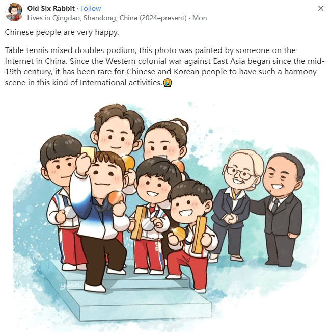 网文来自网友原文翻译投稿,所有言论皆不代表本站立场 | 本文文字/图片来自网络,侵删 | 点击页眉也可刷新 | 注册送50花瓣,每日登录送5花瓣 | 本文内容仅供娱乐,不作任何严肃之用途中国人是如何对待中国在奥运会上输给美国的?中国人会为此感到不开心吗?本文译自Quora,原标题:How are the Chinese dealing with China’s defeat to the US in the Olympics? We are seeing reports of propaganda and disinformation being spread throughout the country, telling its netizens that China won.Lives in Qingdao, Shandong, China (2024–present)乒乓球混双领奖台,这张照片是中国互联网上有人画的。自19世纪中叶西方对东亚发动殖民战争以来,中朝/韩两国人民在此类国际活动中出现如此和谐的场面实属罕见。中法乒乓球男单对决,有人一直用手机晃我们的小胖樊振东的眼睛,谢谢勒布朗指出。今年是中法建交60周年,感谢法国志愿者的欢呼和热情。在蹦床颁奖仪式上,我们热情地拥抱了白俄罗斯选手。伊万-利特维诺维奇,你并不孤单。我看到TikTok上有一群女孩喜欢这些来自中国的游泳男孩,我也是。我的少女心。1932年,洛杉矶,他是第一个参加奥运会的中国人。他叫刘长春,他参加了男子100米和200米的比赛,虽然没有获奖,但这是我们第一次参加奥运会。他是东北大学的学生,他代表了4.883亿遭受纳粹侵略的中国人民。我们的奥运之旅因为被侵略、被封锁而中断了很长时间。1984年,中国拿到了第一枚奥运金牌,他叫许海峰,职业是化肥推销员。他参加了洛杉矶奥运会男子60发手枪比赛,成绩是566分。从第一枚夏季奥运会金牌到第304枚金牌,中国用了40年。中国能走到今天这一步,我们感到非常满意,感谢运动员的不懈努力和中国的可持续发展。顺便说一下,这是中国官方公开的名单,所以1450和反华喷子们没必要利用这些话题来造谣抹黑我们的政府。另外,我觉得中国大陆和香港、台湾省的奖牌应该加在一起。中国取得的成就令人惊叹和赞叹。不仅在经济上,在体育方面也是如此。我感到自豪的是在经历了西方对亚洲的破坏和文化灭绝之后,一个亚洲国家终于重新崛起并重现昔日的辉煌。作为一个印度人,我为我的国家感到悲哀,但同时也为中国能够打破西方宣传的桎梏而感到高兴。如果印度能崛起成为另一个体育强国,那将是亚洲的一大幸事。是的,这是一个很大的“如果”。不幸的是在体育方面印度甚至连亚洲前十名都排不上。让我们不要空抱希望。如果有更多像你、KB和其他志同道合的印度人一样务实、聪明的印度人,印度就会成功,就会像中国一样成功。作为亚洲人,我们应该团结一致,让本世纪成为亚洲的世纪。哈哈哈,我们中国人将在各个领域挑战所有种族运动员创造的极限。即使普遍存在作弊、使用兴奋剂和选区划分等现象,美国仍然无法以压倒性优势获胜,哈哈。现在是时候放弃这种装模作样的体育竞赛了。美国必须赢得一切,因为他们在所有地方都是最棒的,他们的游泳队一半以上都是哮喘病人。这已经变成了另一场对抗性的政治垃圾秀。俄罗斯人被禁赛了。如果不是这样,他们也会拿到不少金牌。在东京奥运会上,俄罗斯共获得71枚奖牌,其中包括20枚金牌。请不要要求美国与两个对手竞争,这对美国运动员不公平。具有讽刺意味的是俄罗斯因为在1980年应邀参加阿富汗战争而被禁止参加奥运会。而美国无缘无故入侵阿富汗并在阿富汗滞留二十年之久,却无人指责。奥林匹克精神不一定是追求比对手更好,也可以是比自己更好。中国已经做到了这一点,更多的金牌,更多的突破,我觉得全国人民都很高兴。我们可以为自己高兴而不必牺牲他人。我们喜欢双赢,而不是输赢或者双输。说得好,没有政治化的角度。奥运会的真正精神似乎在赛前和赛后都被遗忘了。你说的“4.883亿中国人民遭受纳粹侵略”,是指日本纳粹吗?是的,因为日本纳粹1931年9月18日借口入侵中国东北,所以二战在中国爆发的时间应该是这一天。1932年,刘长春要参加奥运会,张学良资助了他。当时,日本纳粹威胁他,最后他代表中国参赛,1937年他因伤退役,后从事体育教育工作。1983年3月25日,刘长春因病在大连逝世。他有两个心愿:这两个愿望分别在1984年洛杉矶奥运会和2008年北京奥运会上得以实现。2008年3月25日,刘长春塑像在大连奥林匹克广场落成。我不认为40比40的金牌数是失利。西方在宣传上挑挑拣拣,比如澳大利亚按人均金牌数统计,(美国)按奖牌总数而不是金牌数统计,等等。只有输得心痛的西方国家才会像小宝宝一样抱怨,如果你赢不了,那就哭吧!!!我现在可以跟着唱中国国歌了,因为它播放的次数最多。