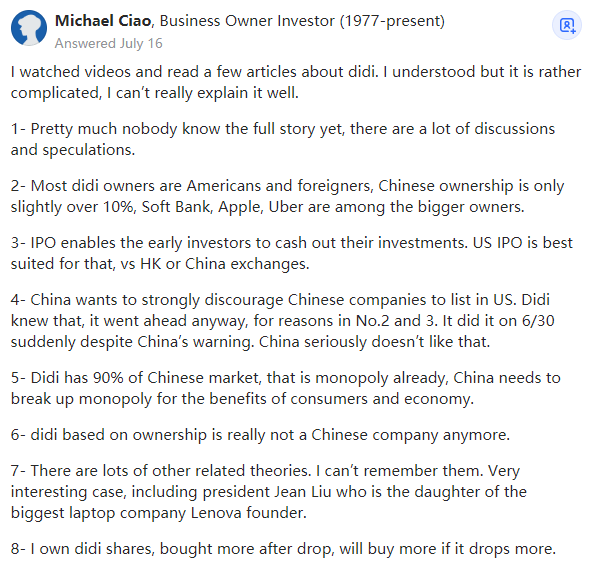 我看了视频,读了几篇关于滴滴的文章。我明白了前因后果,但这有点复杂,我无法很好地解释。1-几乎没有人知道全部情况,目前只有很多讨论和猜测。2-滴滴的所有者大多是美国人和其他外国人,中国人的所有权仅略高于10%,软银、苹果、优步等都是较大的所有者。3-首次公开募股(IPO)能使早期投资者能够兑现他们的投资。与香港或中国大陆的交易所相比,在美国IPO最适合这种情况。4-中国强烈反对中国公司赴美上市。滴滴知道这一点,但无论如何,因为第2点和第3点的原因,它没有停下来。它不顾中国ZF的警告,在6月30日突击上市。中国极其不喜欢这样。5-滴滴占有90%的中国市场,它已经处于垄断地位了,为了消费者的利益和经济发展需要,中国需要打破垄断。7-有很多其他相关的推测,我记不起来了。这是一个很有趣的案例,包括它的总裁柳青(Jean Liu)是最大的笔记本电脑公司联想的创始人的女儿。我持有滴滴的股票,如果下跌我会买入更多。如果下跌得更多,我会买入更多更多。