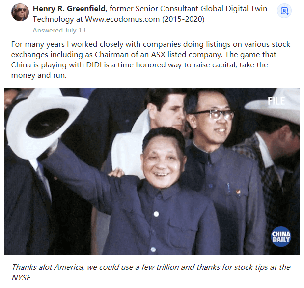 曾任ecodomus.com全球数字技术高级顾问(2015-2020),2019年至今生活在澳大利亚多年来,我与在多家证券交易所上市的公司有着密切的合作,其中包括担任一家澳大利亚证券交易所上市公司的董事长。契丹正在与滴滴玩的是一种古老的筹资、拿钱和跑路的游戏。我一分钟也不相信这与对滴滴的数据和控制有关,因为他们可以在任何时候而不是在股票上市第二天股价达到最高点时这样做。这种做法并不是要在10天内将滴滴的市值下调215亿美元,这就是价格操纵。当公司发行新股来筹集资金时,这些股票在上市时已经具有了预期价值。如果你买了这家公司的股票,你的钱就转移到这家公司了。这笔钱会直接进入公司的银行账户,再减去他们付给经纪人的交易费用,这些费用有时可能会很高,不过这对公司来说还是非常有利可图的。滴滴从美国人那里获得了50亿美元的新资本,当中国表示将对“数据问题”进行监管时,买了滴滴股票的美国人迅速失去了所有的钱,这是书中最古老的把戏。中国不断压低滴滴的股价,使其市值从700-800亿美元降至500亿美元以下。滴滴可以通过他们的经纪人以低价回购股票,这样他们可以用10-20亿美元,买回原本价值40-50亿美元的股份,因为每个人都想抛售他们的股票,这样他们会净赚30-40亿美元的新资本。虽然新投资者不见了,但它们的股票价格没有失去控制,股票价格合理,手中现金充裕。干得好,滴滴。最后,滴滴毫无损失就从美国投资者身上套现了50亿美元,加上他们期待的股价暴跌,他们收购了投资者刚刚贱卖的股票,带着大笔现金满载而归。中国知道当邓戴着牛仔帽访问纽约证交所时,中国会成为游戏的主人,他们每次都能打败美国人。美国人只不过是在继续往中国铲钱。就像有人说的,如果你笨到把它送给他们,那么他们会聪明到可以接受它。这种游戏在世界各地每天都在上演,然而只有在中国,政府才会与企业合作来敲诈外国投资者。为高深莫测的中国人再打一分。而对你来说,如果你真的投资了他们,中国人对此有一个说法:ZOU GOU(运气不好)。这完全是无稽之谈,而且完全是从西方贪婪的观点出发的。这与政府无关,别忘了中国人是滴滴的主要投资者,就像美国人是亚马逊的主要投资者一样。中国给滴滴盖上了盖子,就像他们对蚂蚁金服盖上盖子一样,他们不想让大鳄垄断某些市场,因为这可能让滴滴公司在破产后把包袱丢给政府,这是从2007年美国金融危机中吸取的教训,这与外国投资者完全无关。MD at Surgery Center,Lived in Melbourne, Victoria, Australia2018–2020