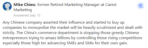 Carest Marketing公司前营销经历,生活在马来西亚吉隆坡任何一家中国公司宣称自己的影响力并开始收购企业垄断市场时,都将受到严格的审|查和处理。中国商务部正在阻止那些试图通过控制那些不断发展的竞争对手,尤其是高科技行业的中小企业来敛财的贪婪的中国企业家。