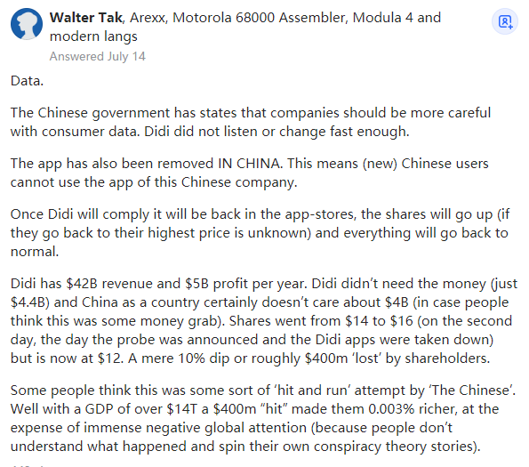 中国表示,企业应更加谨慎地处理消费者数据,滴滴没有听或改变得不够快。该应用程序在中国也被移除了,这意味着(新的)中国用户无法使用这家中国公司的应用程序。当滴滴遵守这些规定时,它将回到应用程序商店,它的股价也将上升(是否会回到最高价还尚未可知),一切都将恢复正常。滴滴每年的收入为420亿美元,利润为50亿美元,滴滴不需要这笔钱(只有44亿美元)(译注:应该是指本次IPO的额度)。作为一个国家,中国当然也不会在乎区区40亿美元(以防人们认为这是抢钱)。滴滴的股价从14美元涨到了16美元(调查结果公布和滴滴应用程序被关闭的第二天),但现在是12美元。股东们仅仅损失了10%或大约4亿美元。有人认为这是“中国人”的某种“拿钱跑路”企图。好吧,在GDP超过14万亿美元的情况下,一次4亿美元的“打击”只能让他们富裕0.003%,而代价是巨大的负面的全球关注(因为人们不了解发生了什么,他们会编造自己版本的阴谋论故事)。Business Owner Investor (1977-present),Lives in San Francisco Bay Area