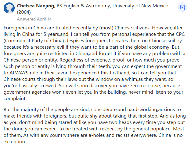 新墨西哥大学英语与天文学学士(2004年),2017年至今生活在越南在中国的外国人受到了(大多数)中国公民的体面对待。然而,在中国生活了5年之后,我可以从个人经验告诉你,中国GC|党鄙视外国人,他们之所以在中国的土地上容忍他们,是因为如果他们想成为全球经济的一部分,这是一种必要之恶。但是外国人在中国受到很大的限制,如果你与中国人或任何实体有任何问题,那你还是忘了吧。不管你有什么证据证明这些人或实体在撒谎,你总是会看到事情对他们有利。我亲身经历过,所以我可以告诉你,中国|法|院可以随心所欲地根据他们的法|律来做出判决,所以你基本上完蛋了。你很快就会发现你没有追索权,因为政府机构甚至不会让你进去,更别说听你的抱怨了。但大多数中国人是善良的,体贴的,勤奋的,他们渴望与外国人交朋友,但他们对迈出第一步却相当害羞。只要你不介意每次出门就像你有两个脑袋一样被人盯着看,你就能得到大多数普通民众的尊重。和任何国家一样,到处都有混蛋和种族主义者,中国也不例外。Realtor, Quora Top Writer Badge 2018, MBA U of R, (1999-present),Lived in Pomona, CA