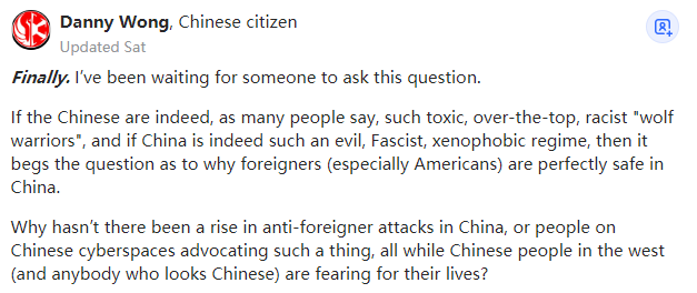 如果中国人真的像很多人说的那样是一个有毒的、过分的、种族主义的“狼战士”群体,如果中国真的是一个邪恶的、法西斯的、仇外的政权,那么这就提出了一个问题:为什么外国人(特别是美国人)在中国是十分安全的。为什么在西方的中国人(以及任何看起来像中国人的人)都在为自己的生命担忧的时候,中国的仇外攻击事件,或者中国网络上鼓吹这种事情的人却没有增加?我想看看那些反华人士的解释,请随便留言。同时,我将做好被冒犯的准备并视情况提出自己的看法和理解。并非所有的文化都是一样的,有些文化比其他文化要好。中国文化是优越的。不是因为我们是最伟大的战士、科学家、艺术家或政治家。相信我,我们不是。我们有一种礼貌和尊重我们的客人的文化。除了中国以外,没有其他国家在本国公民之前给予外国人特权,无论是在医疗保健方面(例如在中国的外国人在紧急情况下被法律优先考虑接受输血)、执法方面(例如警察被要求首先帮助外国人),或教育(见:留学生在华学伴争议-维基百科)。只有中国人会收养那些死敌(他们犯下的罪行甚至震惊了纳粹)的孤儿——并把他们当作自己的儿子抚养(见:日本在华遗孤-维基百科)只有中国人认为一部爱国主义/民族主义的电影是仇外的主角殴打当地人的电影。请参见:没有任何一个国家像中国人那样竭尽全力取悦于(bends over backwards)外来者。虽然现在中国有14亿人,但在特朗普的贸易战期间、在我们与澳大利亚因一幅漫画而争吵期间,或者在最近的西方反亚裔仇恨浪潮期间,没有一个人对外国人(或长相像外国人)犯下仇恨罪。我们知道没有中国人做出仇恨犯罪,因为如果真的有,反华报纸(比如鲁珀特·默多克旗下的报纸)会呼吁与中国进行血腥和全面战争,你认为西方媒体会放过任何诋毁中国的机会吗?虽然我同意中国文化对很多人都很好,但我认为指出缺点也很重要:Ø 执法部门可能会先听取外国人的意见,但他们一般都站在当地人一边。Ø 中国人对大多数外国人相当好,但对印度人和深色皮肤的人(不管他们来自哪里)就不那么好了。你说的第二点尤其正确,这是我们作为一个国家必须努力解决的问题。即便如此,表面上表现出厌恶和拒绝与对生命的恐惧之间有很大的区别。大多数中国人可能不愿意和肤色较黑的外国人交往,但我们不会动用私刑处死他们,也不会当众殴打他们。我希望世界其他地方,而不仅仅是在美国的中国人和长得像中国人的人也能受到这样的待遇。我认为你在中国看不到针对外国人的仇恨犯罪,是因为你从一开始就看不到中国的犯罪,暴力犯罪在中国几乎不存在。尽管近年来中国的仇外情绪有所上升,但并非如你在美国看到的那样,在中国再多的仇外情绪也不会导致仇恨犯罪。中国文化本质上是非对抗性和非暴力的。我也相信中国的媒体不会像西方那样做一些反华的虚假宣传,正是这些宣传导致了对亚洲人的袭击!我想你得问问自己,黑人更愿意和哪个国家的警察打交道——美国警察,英国警察,还是中国警察。众所周知,中国人(和东亚大多数亚洲人一样)会回避非洲移民,这主要是因为缺乏了解。这和美国黑人面临的种族歧视有很大区别。BS English & Astronomy, University of New Mexico (2004),Lives in Vietnam2017–present
