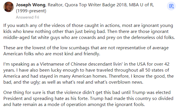 房地产经纪人,工商管理硕士(1999年至今),居住在加利福尼亚州波莫纳如果你看看那些被抓的人的任何一个视频,你就会发现他们大多数都是无知的孩子,他们除了做坏事以外什么都不知道。还有那些无知的中年白人胖子,他们是懦夫,他们袭击毫无防御能力的老人。这些人是最低级的卑鄙小人,不能代表最善良、最友好的普通美国人。我是一个在美国生活了42年的越南人,我很幸运地走遍了美国的50个州,并曾在许多美国家庭居住过。因此,我知道什么是好的,坏的,丑陋的,以及什么是真实的,什么是夸大的消息。有一点可以肯定的是,直到特朗普当选总统,传播仇恨成为他的强项,美国的暴力才变得如此糟糕。特朗普使这个国家如此分裂,仇恨仍然是无知的傻瓜们的一种行为方式。犯下这些罪行的年轻人被录了下来,然后被逮捕,他们都是不知道自己在做什么的恶作剧者。中国人多年来一直是种族主义者袭击的目标,因为他们常常被视为是没有防御能力的人。但他们并不是唯一的受害者,黑人,墨西哥人,古巴人,包括其他有色人种都经历过白人至上主义者的仇恨罪行。黑人每天遭受的私刑和歧视最多。胆小鬼把坏名声误认为是可以向同龄人炫耀的英雄行为,你可以看到许多公共财产被涂鸦涂污,这些行为没有一项得到了美国公众的宽恕。每个国家都有自己的问题和坏蛋,请不要说这是美国的常态。我可以向你保证,这些只是社会上懦弱的人渣们随意实施的暴力行为。大多数美国人不仅不恨中国人,而且他们张开双臂欢迎他们。CEO/Founder (2020-present)