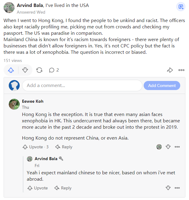 当我去香港的时候,我发现人们是不友善和种族主义的。警察们还不断对我进行种族歧视,他们将我从人群中挑出并检查我的护照。美国与之相比就是天堂。中国大陆以对外国人的种|族|歧|视而闻名——有很多行业不允许外商进入。是的,对外国人的种族歧视不是中|供的政策,但事实是这里有很严重的仇外心理。提问者提的这个问题是不正确的或有偏见的。香港是个例外。诚然,即使许多亚洲人在香港也面临仇外心理。这种潜在的情绪一直存在,但在过去20年中变得更加尖锐,并在2019年爆发了抗议活动。是的,基于我在国外认识的人,我期望中国大陆人会更好。