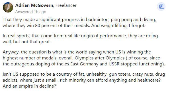 他们在羽毛球、乒乓球和跳水方面取得了重大进步,赢得了这些项目的80%的奖牌。差点忘了,还有举重。在真正的体育运动中,在那些现实生活中的体育运动中,他们做得不错,但也没那么好。不管怎样,问题是当美国在一届又一届的奥运会上赢得了最多的奖牌时,世界是怎么看的(当然,是自从东德和苏联停止滥用兴奋剂以来)。难道我们不应该是一个肥胖、不健康、满是持枪者、疯子、吸毒者的国家吗?难道我们不是一个在那里只有一小部分富有的少数人能够负担得起任何东西和医疗费用的国家,是一个衰落的帝国吗?former Retired Maths Lecturer (1969-2004)