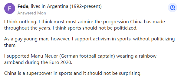 我想没什么。我想大多数人都会钦佩中国多年来取得的进步,但我认为体育不应该被政治化。然而,作为一个年轻的同性恋者,我支持体育运动中的行动主义(译注:activism,意思是促进、阻止,指导或干预社会政治、经济或环境改革而进行的努力,以期改变社会),而不是将其政治化。在2020年欧洲杯期间,我支持Manu Neuer(德国足球队队长)佩戴彩虹臂章。