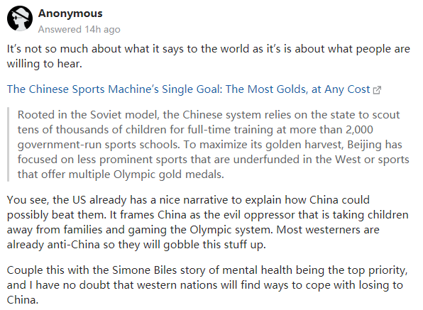 我一直很钦佩中国人在奥运会上的出色表现,中国在这一届奥运会上获得的奖牌已经超过了印度在过去100年中获得的奖牌。如果中国像加利福尼亚州一样重视游泳,拥有一个良好的教练网络和人才培养计划,并投资于公共游泳池以吸引人们,尽早发现有天份的人才并允许成立俱乐部……那么中国可能很快会攀升到更高的高度。一名优秀的游泳运动员可以在一届奥运会上获得六枚或更多的金牌。近几十年来大多数“美国”奥运奖牌都是由加利福尼亚人获得的(参见加利福尼亚州在夏季奥运会上占据美国各州奖牌总数的主导地位,也击败了大多数国家)。这在很大程度上是由于更好的饮食习惯和与美国人不同的生活方式,以及对体育设施进行的公共投资以及良好的教练和培训网络。如果中国愿意,所有这些都是可以复制的。我预计,中国游泳运动员在未来几年将给人留下深刻印象,前提是中国关注加州的所作所为,并说“让我们也这样做吧。”我不建议用一个国家赢得的奥运会奖牌数量来评价一个国家的经济或社会健康状况。东德曾经获得过大量的奖牌,但东德是一个软弱腐败的国家。印度在所有方面都是世界上伟大的经济体和社会之一,但他们几乎没有赢得任何奖牌。与其说它会对世界说些什么,还不如说人们愿意听什么。中国体育机器的唯一目标是:不惜一切代价获得最多金牌植根于苏联模式的中国体育体制依赖于国家在2000多所公办的体育学校中为数万名儿童进行全日制训练。为了最大限度地获得金牌,北京将重点放在了西方投入不足的,不太突出的体育项目或是能够提供多枚奥运金牌的体育项目上。你看,美国已经有了一个很好的故事来解释中国为什么可能打败他们。它将中国描绘成一个将儿童从家庭中带走,并与奥林匹克制度博弈的邪恶的压迫者。大多数西方人都是反华的,所以他们会全盘接受这些说辞。再加上西蒙尼·拜尔斯(Simone Biles)关于精神健康是头等大事的故事,我毫不怀疑西方国家会找到应对在奥运金牌棒上输给中国的办法。Public Relations,Lives in New Jersey