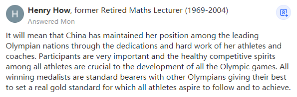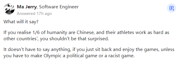 如果你意识到六分之一的人类是中国人,他们的运动员和其他国家一样努力,你就不应该感到惊讶。如果只是坐下来享受奥运会,它不需要说什么,除非你不得不把奥运会变成一场政治游戏或种族主义游戏。