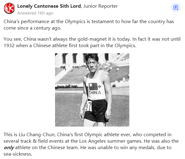 网文来自网友原文翻译投稿,所有言论皆不代表本站立场 | 本文文字/图片来自网络,侵删 | 点击页眉也可刷新 | 本文内容仅供娱乐,不作任何严肃之用途如果中国在奥运奖牌榜上占据榜首将说明什么?西方将如何应对?本文译自Quora,原标题:What will it say to the world if China wins the most Olympics medals?Lonely Cantonese Sith Lord中国在奥运会上的表现证明了一个世纪以来这个国家已经走了多远。你看,中国并不总是像今天这样吸引人。事实上,直到1932年中国运动员才首次参加奥运会。这是刘长春,中国有史以来第一位参加奥运会的运动员,他参加了洛杉矶夏季奥运会的多项田径项目,他也是中国队唯一的运动员。但由于晕船,他没有赢得任何奖牌。他能参加比赛这一事实简直是一个奇迹,因为当时的中国甚至还不是一个统一的国家。中国东北部的土地被日本人入侵和占领,日本人在那里建立了一个名为满洲国的傀儡国。由于忙于第二次中日战争,中国正式退出了1932年的夏季奥运会。满洲国政府承诺,如果刘长春愿意以满洲国的名义参赛,他们将赞助他。对此,刘长春回答说:“我是中华民族的儿子,任何真正的中国人都不会代表满洲国参加奥运会”。幸亏爱国军阀张学良捐赠了8000大洋,他才得以在最后一刻参加奥运会。现在,中国统一了,外国帝国主义者不再占领其领土并奴役其人民。中国的运动员只要证明自己是有价值的,就可以自由参加国际体育赛事。他们可以以自己国家的名义参加比赛,并由自己的国家赞助,而不受军阀或外国傀儡国家摆布。中国队不再只有一个人,而是人才济济。中国队不再一枚奖牌都拿不到,而是赢得了最多的金牌。一个国家如何在如此短的时间内经历如此剧烈、积极的变化?这是任何有求知欲的,诚实的人都会感兴趣的问题。如果他们只能看到吃蝙蝠、小眼睛之类的,那么这完全是他们的选择和损失。更令人印象深刻的是,当你意识到中国在1984年之前从未获得过任何形式的奥运奖牌时。昨晚在浏览Quora的时候,我发现至少有3条评论是这样的:“中国正在有选择性地培养人才,培养出优秀的运动员,就像那个超级士兵计划的传闻一样……”这让你想明白有些人已经会变得多么可笑。如果你考虑到金牌得主张雨菲出生于父母都是游泳教练的家庭,她从3岁起就开始游泳,那么这些评论听起来确实有点“真实”(狗头)。哦,并没有!英国人也在这样做!2016年,英国径赛自行车手、奥运会金牌最多(6枚)和奖牌最多(8枚)的Jason Kenny与奥运会历史上最成功的女子径赛自行车手Laura Trott结了婚,2017年他们生了一个儿子!我打赌他们也给他买了一辆自行车!看看邪恶的英国超级运动员优生学计划的证据吧!在澳大利亚板球比赛中也发生了类似的事情,女子板球运动员Alyssa Healy与男子队队友Mitchell Starc结了婚。