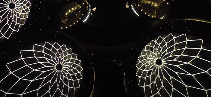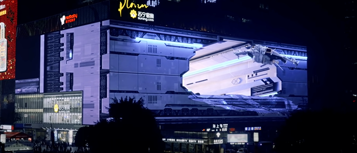 Reporterfy Media & TravelA gigantic 90-degree curved LED digital signage installation, set above a retail space in Chengdu, China, is showing a 3D-effect video which appears to show a Star Trek-like spaceship emerging from the screen to the space in front of it.Best viewed from an angle, the glasses-free ‘3D’ video wall has been a top-five trending topic on Sina Weibo, a Chinese social media network that is similar to Twitter, during a Chinese national holiday.这是一个巨大的呈90度弯曲的LED数字广告装置,位于中国成都的一个零售商场的上方,它们正在播放一个有3D效果视频,显示一艘星际迷航般的宇宙飞船从屏幕上出现在它前面的空间。在中国国庆期间,裸眼“3D”视频墙一直是新浪微博上的五大热门话题之一。新浪微博是一个类似于Twitter的中国社交媒体网络。